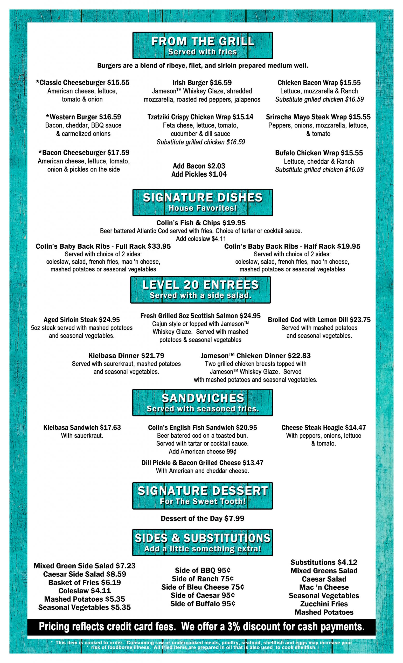 Our signature menu item is Colin’s Traditional English Fish & Chips. We also proudly plate up what we consider to be the Best WINGS around with our house-made wing sauces. Our menu features delicious entrees, as well as sandwiches, salads, and more casual fare.